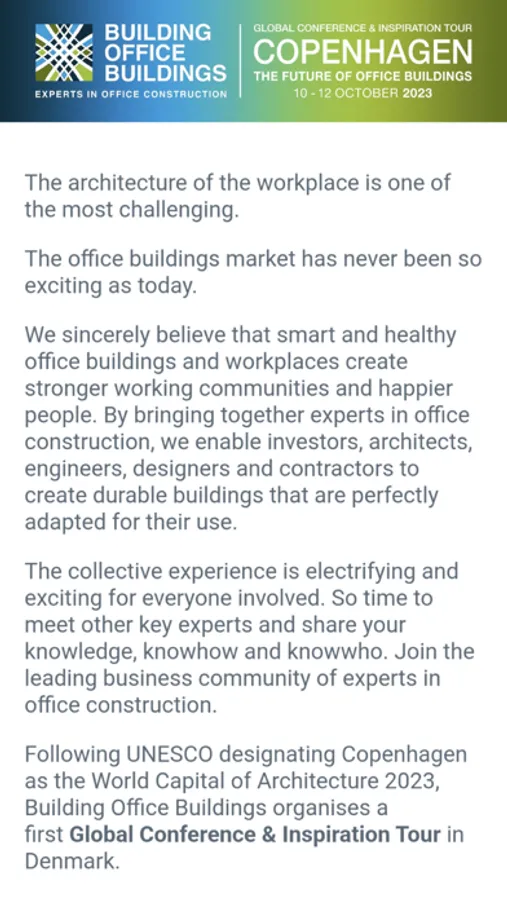 Following UNESCO designating Copenhagen as the World Capital of Architecture 2023, Building Office Buildings organises a first Global Conference & Inspiration Tour in Denmark.