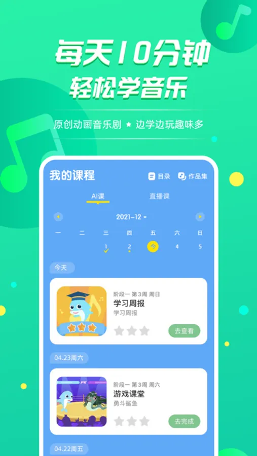 音乐启蒙Ai课采用独创的人工智能音乐AI,通过原创动画音乐剧《音小豚环游世界》+ 趣味音乐游戏闯关+ 专业老师辅导的全新教学模式,每天仅需10分钟,让孩子自主学习视唱练耳及乐理知识,全面提升孩子音乐欣赏能力和艺术修养。