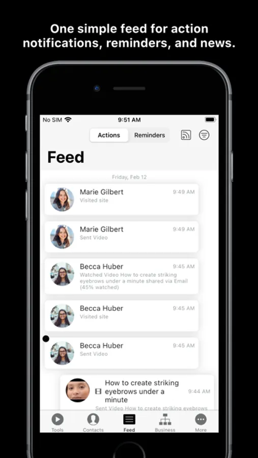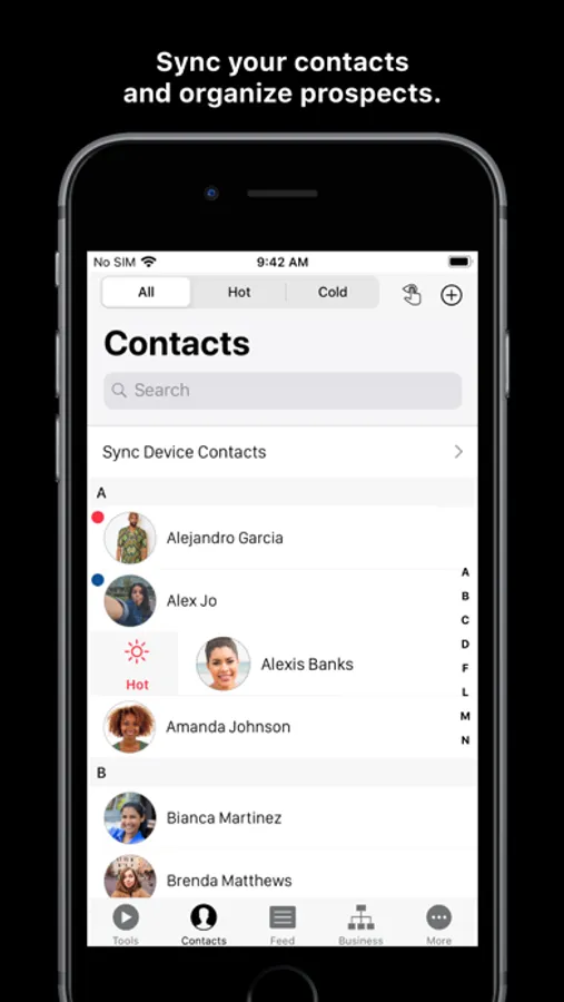 Contacts: Choose how to sync and manage your contacts. Swipe to sort them by interest level. You can make connections, add notes, or check out the Contact Feed to see the tools you’ve shared and contact actions.