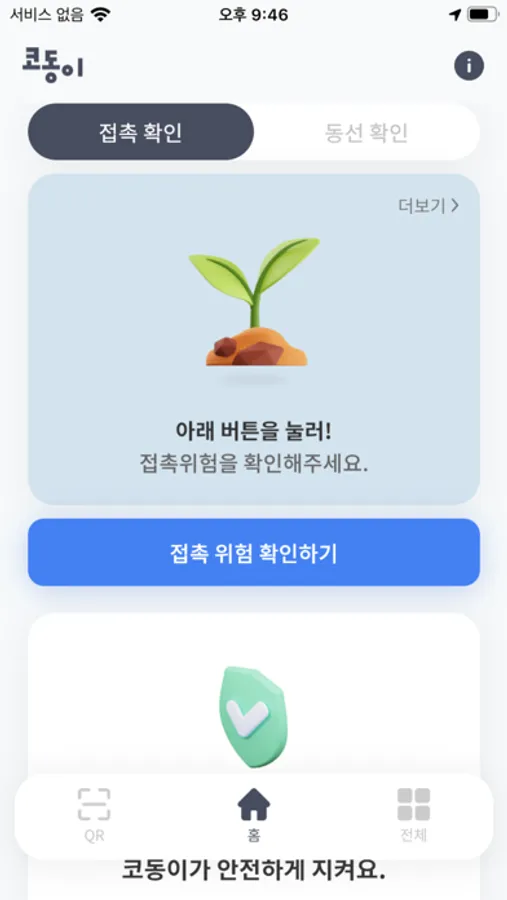 안심이의 메인화면의 ‘접촉 위험 확인하기’버튼을 사용하여 접촉 위험 유무를 확인하세요. 사용자 휴대폰에 저장된 방문장소와 확진자의 방문장소를 비교해, 확진자와 접촉 위험 유무를 판단해 줍니다.