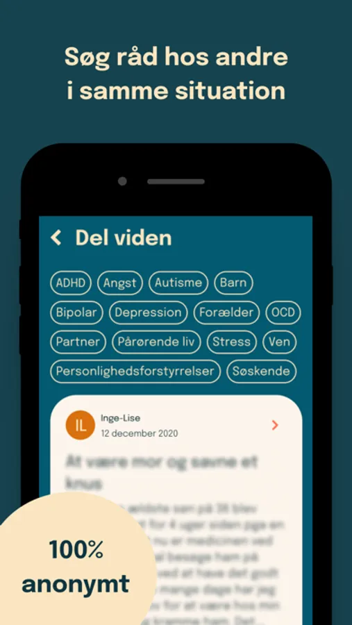 Sammen med 700 pårørende, har vi skabt et frirum for dig som pårørende. Du får et trygt fællesskab med andre pårørende, hvor du kan få gode råd fra andre og hjælp til dine egne udfordringer og bekymringer – 100% anonymt.