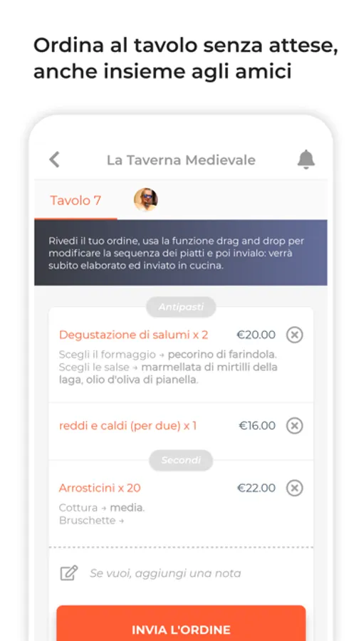 Per ogni piatto potrai scegliere delle aggiunte, delle varianti o comunicare eventuali allergie. Il tuo ordine arriverà direttamente in cucina ed in caso di bisogno potrai sempre chiamare il cameriere.