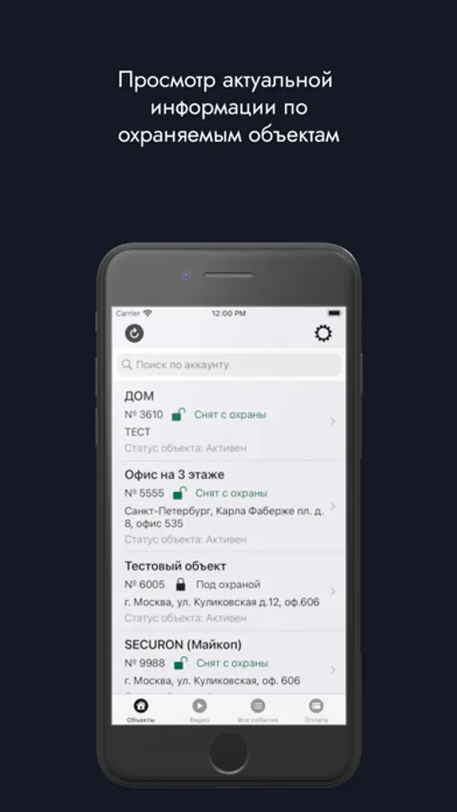- статус охраны всех охраняемых объектов на одном экране;
