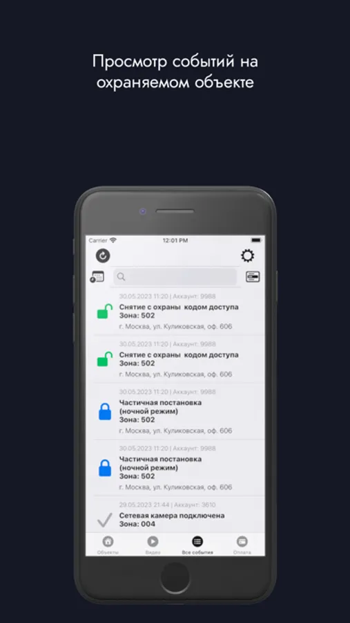 - push-уведомление о всех событиях на объекте;