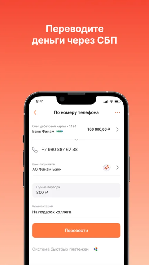 • Переводы по номеру телефона между клиентами АО «Банк «ФИНАМ»