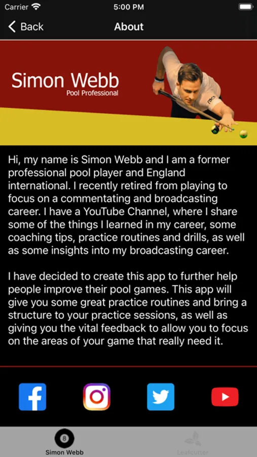 Simon says "I have decided to create this app to further help people improve their pool games. This app will give you some great practice routines and bring a structure to your practice sessions, as well as giving you the vital feedback to allow you to focus on the areas of your game that really need it."