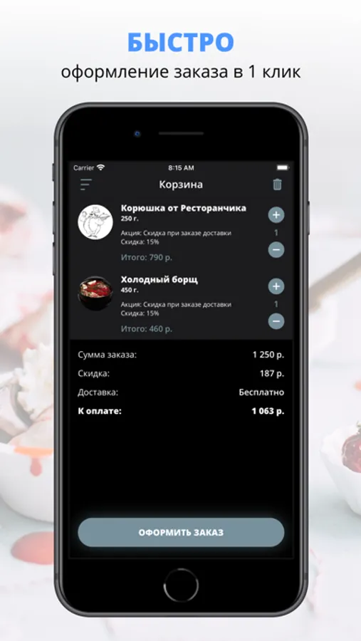 Скачивайте наше приложение, оформляйте заказ и наслаждайтесь любимой едой, где бы Вы ни были! Приятного аппетита!