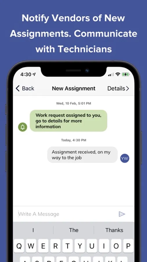 Simple, uncluttered screens and guided workflows make it easy for vendors to respond to new requests, schedule authorized work, and assign technicians. Technicians can easily check-in, message with their co-workers, report work updates, and documents task completion. User training is minimal, and the EZMaxVendor app can also be launched directly from any push messages received.