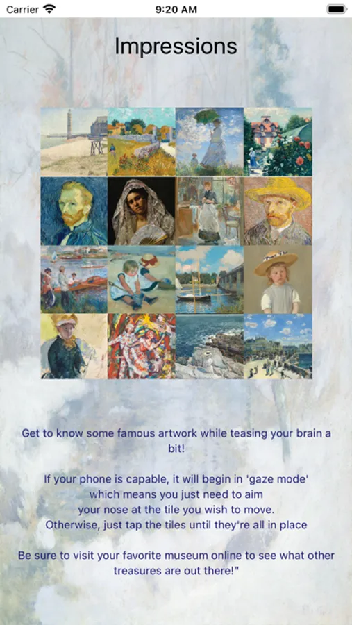 Discover famous Impressionist art while teasing your brain unscrambling the tiles. Select your level of difficulty.
