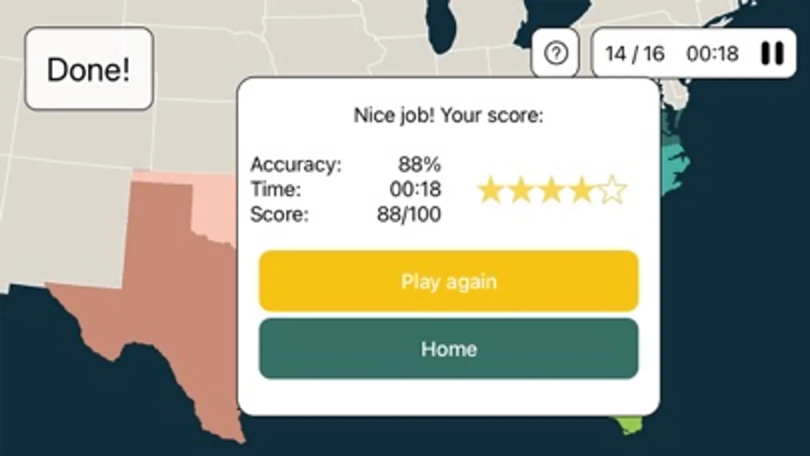All continents are divided into regions and subregions to allow for simpler and faster learning. No zooming or panning necessary… simply tap on the location of the country when prompted.