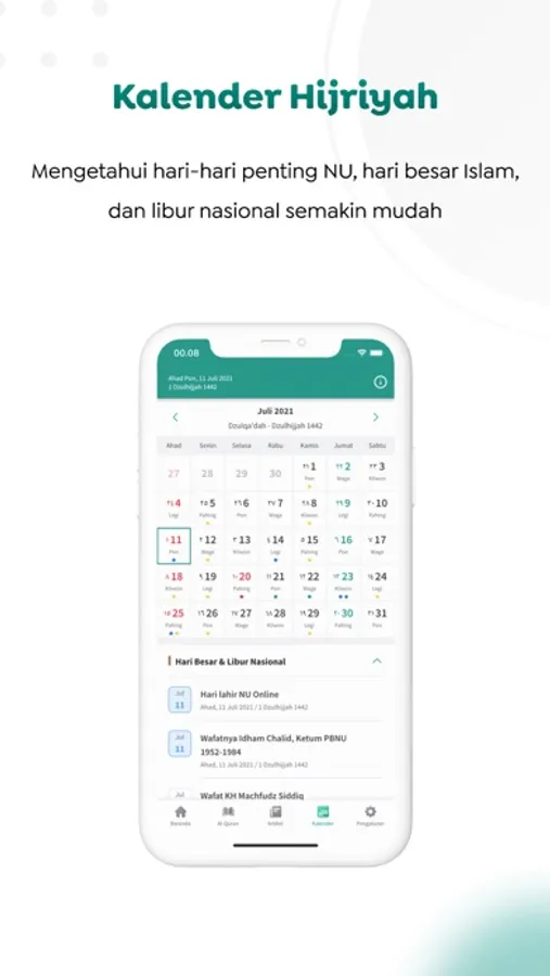 Tak hanya penanggalan Masehi dan Hijriah, kalender ini juga dilengkapi penanda hari pasaran Jawa (Legi, Pahing, Pon, Wage, Kliwon), hari-hari besar Islam, libur nasional, dan momen penting NU.