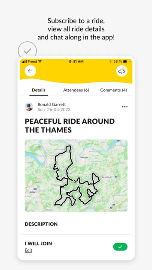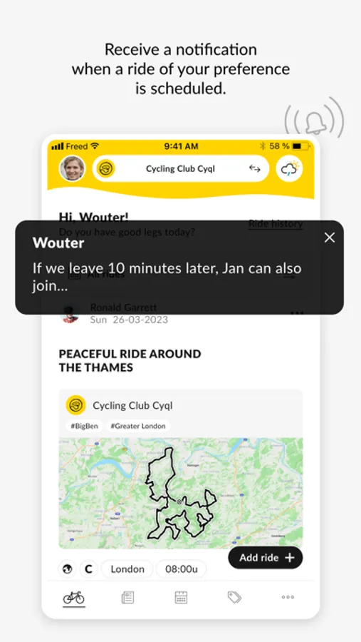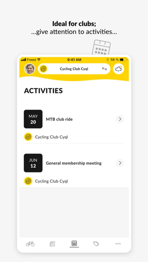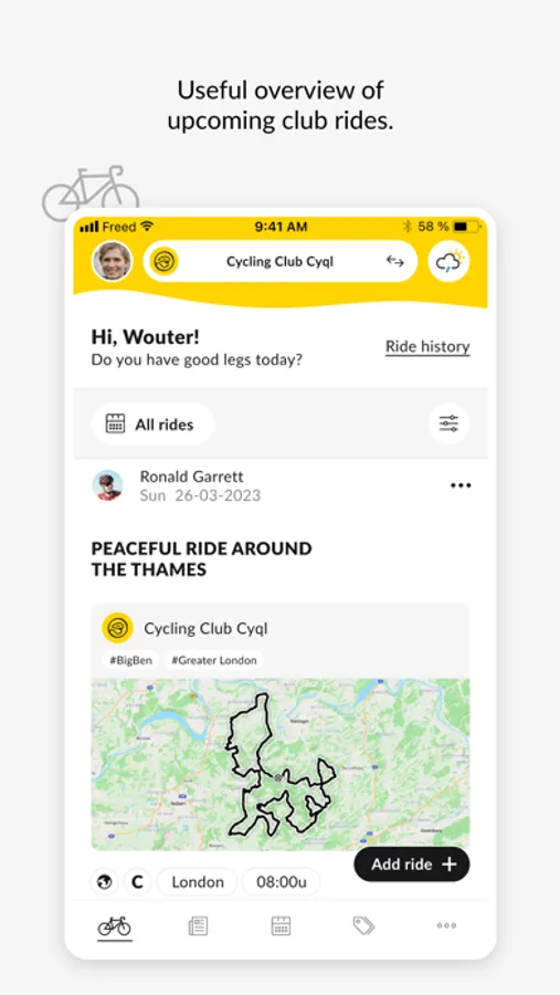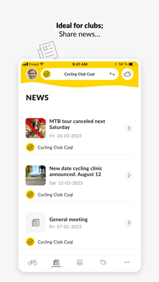 Check out your club's calendar, and read the latest news. No more confusing app groups, but all the relevant communication about your cycling club in a single app. Consult the handy face directory and get in touch with other members of the cycling group.