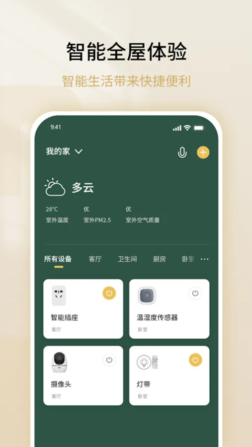 通过智能网关连接智能家居中的家庭安防、氛围营造、居家环境、智能交互类智能设备,您可以:
