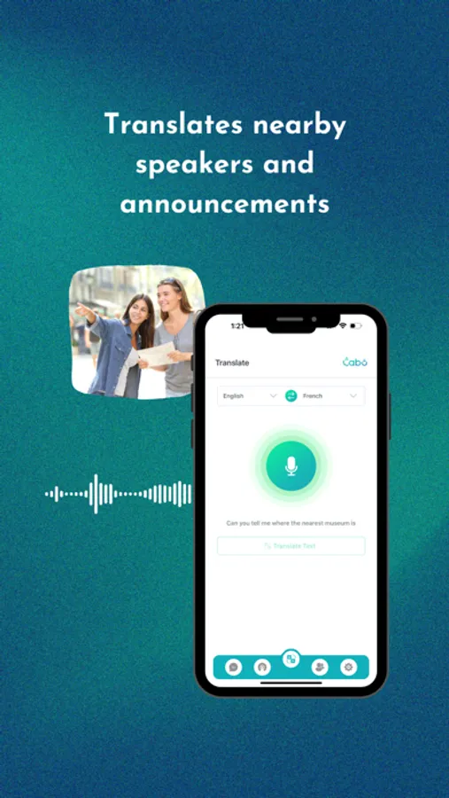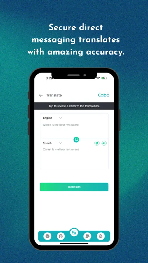 Meet Cabo, your personal real-time translator. Cabo securely translates text, audio and images with instant, accurate, natural translations. Speak or type what you want to say, and Cabo will immediately translate into the language of your choice. Cabo can even translate images such as signs, menus and more.