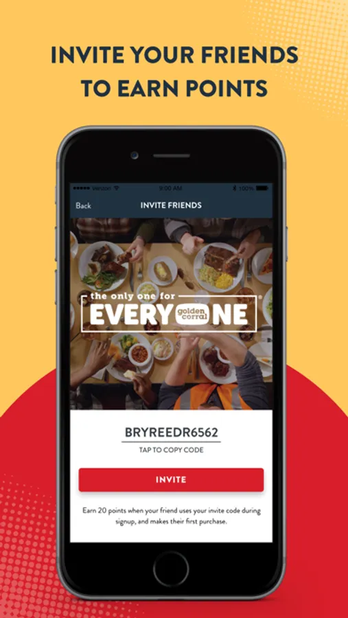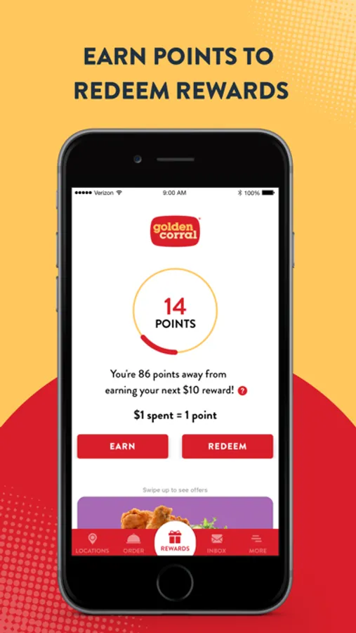 Register for Good as Gold Rewards and earn points automatically when you order through the app. Scan your code or upload your receipt to earn points for dining at your local Golden Corral. Earn bonus points for referring friends and family. Get rewards for registering, through earning points, and on your birthday.