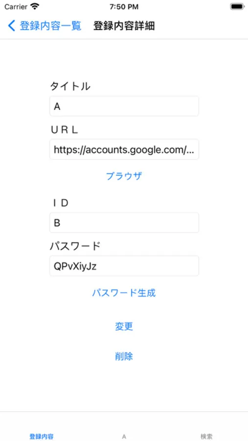 タップすると8文字の数字、大小英字が混在したパスワードを自動生成します。