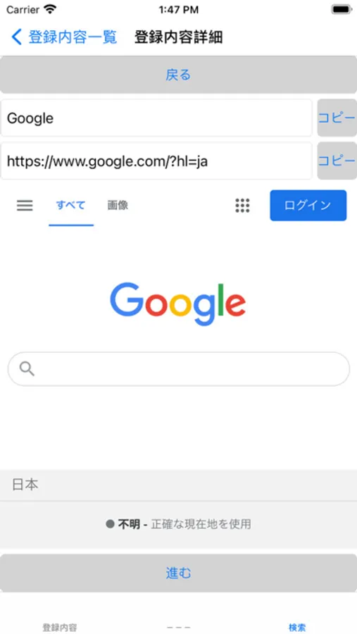 「進む」「戻る」ボタンは、通常のブラウザと同様です。