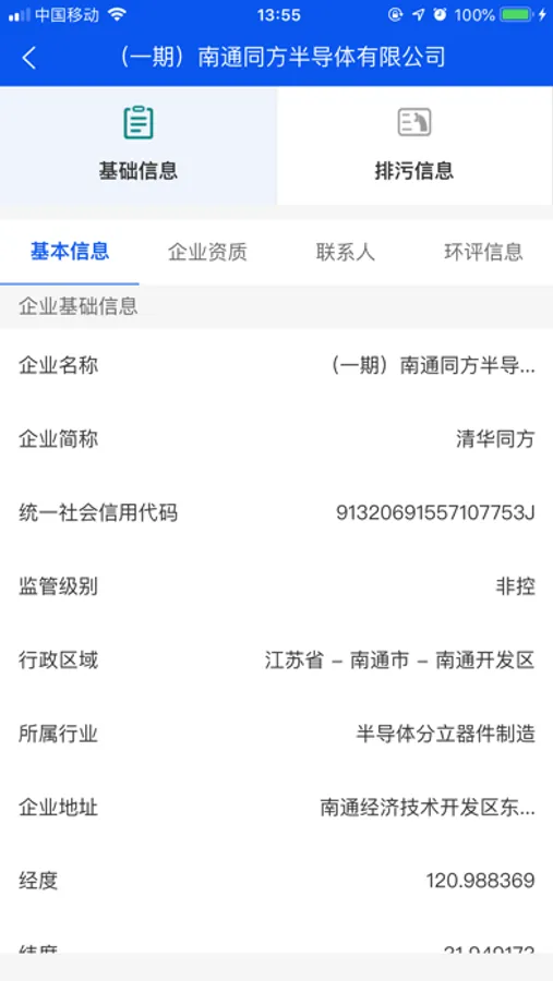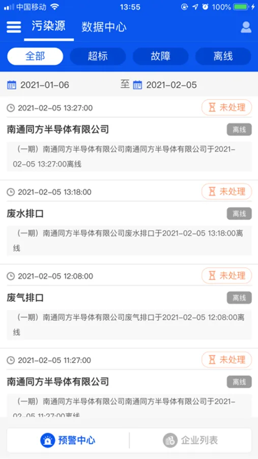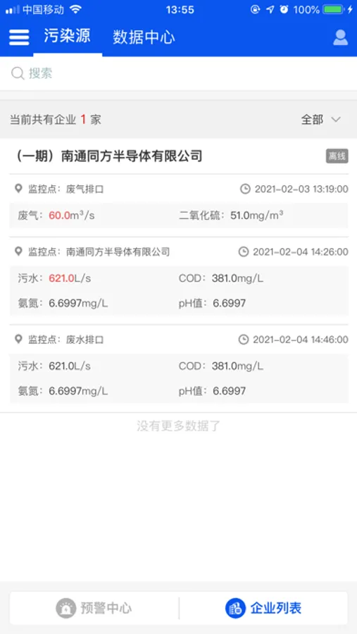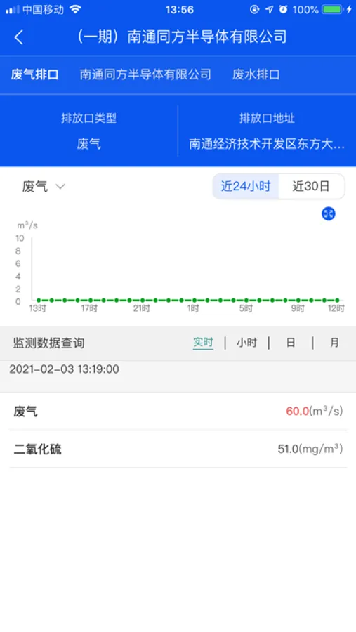 企业环境预警包含污染源在线和数据中心等菜单,用户可根据自己需求自由切换调整菜单的顺序,可查看本企业污染物排放信息和基本信息。程序通过图表两种展现方式实现数据可视化,可轻松查看各关注点的历史数据和当前各项污染物浓度数值。
