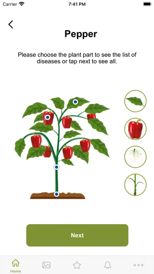Easy to navigate menu where the user can choose the part of the plant where the symptoms appear.