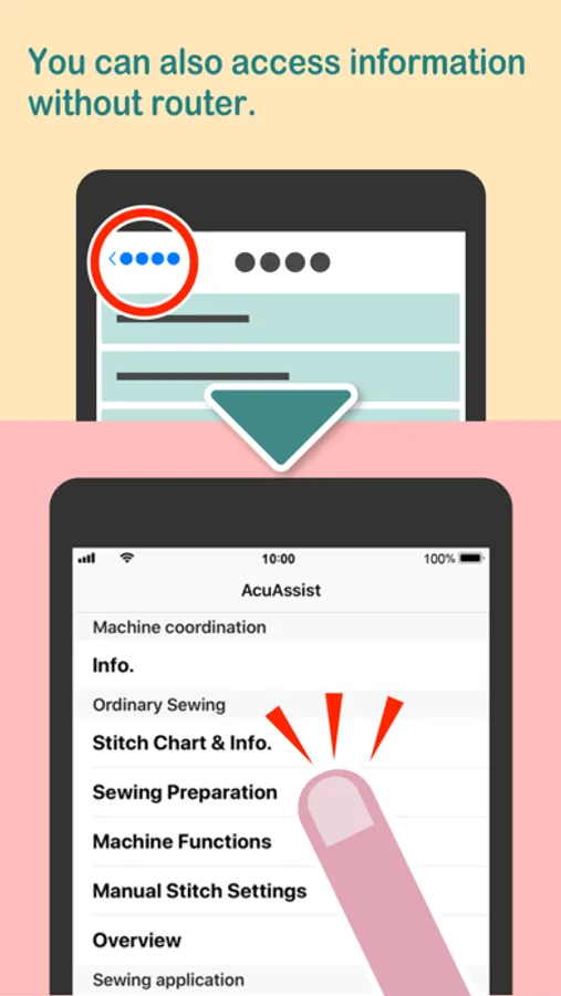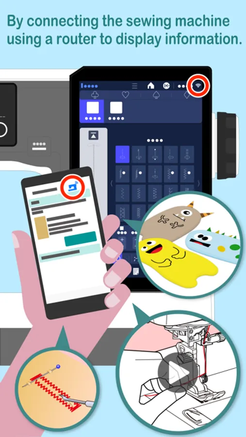 * By connecting the sewing machine and app using a router, instructions and know-how related to the status of the sewing machine appear in the app.