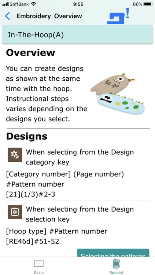 * From the lists within the app, built-in stitches and designs can be selected and displayed on the sewing machine.
