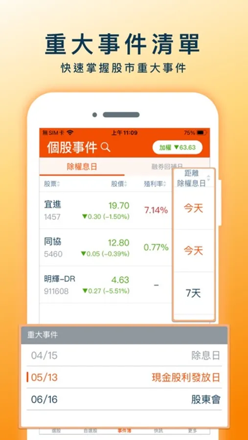 統整最近即將除權息、融券回補的股票,讓你快速掌握公司最新事件動態。搭配行情分析功能,找出重大事件交易獲利的可能。