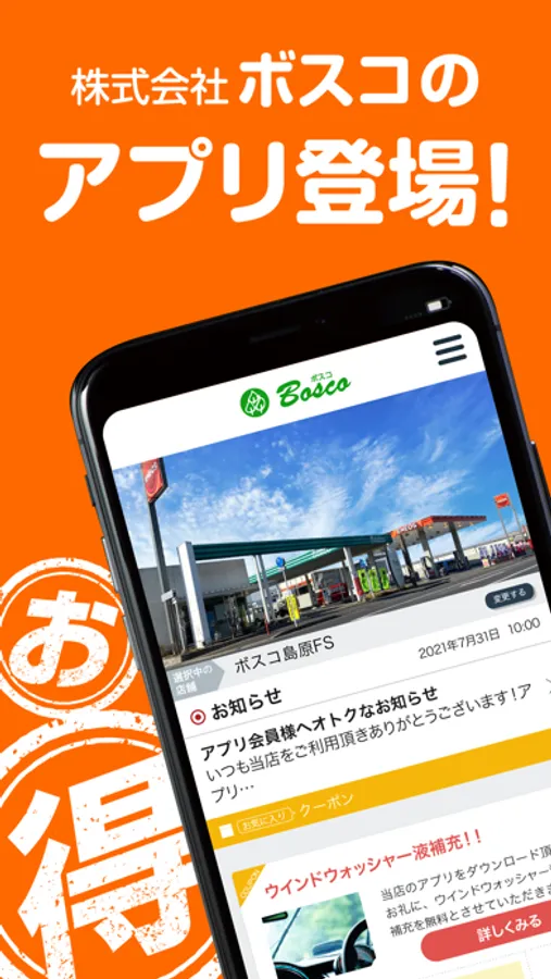 当社のアプリ「ボスコアプリ」ではアプリで簡単に洗車・コーティングなどのご予約や愛車のメンテナンス管理が可能の他、ご登録いただいた店舗で利用いただけるお得なクーポンや各種メニューの割引情報を配信しております。