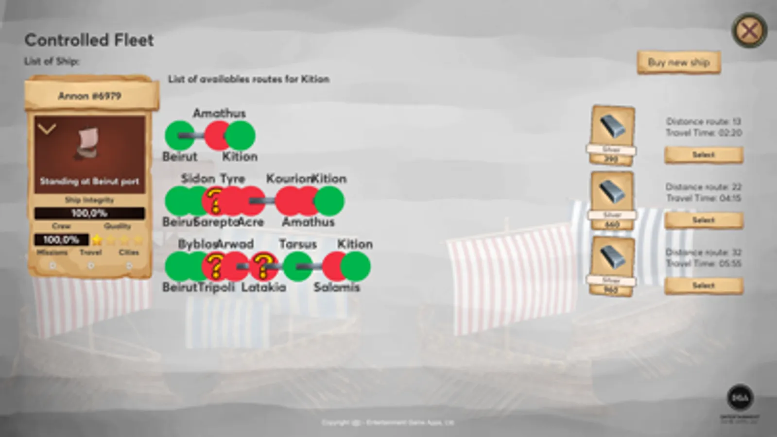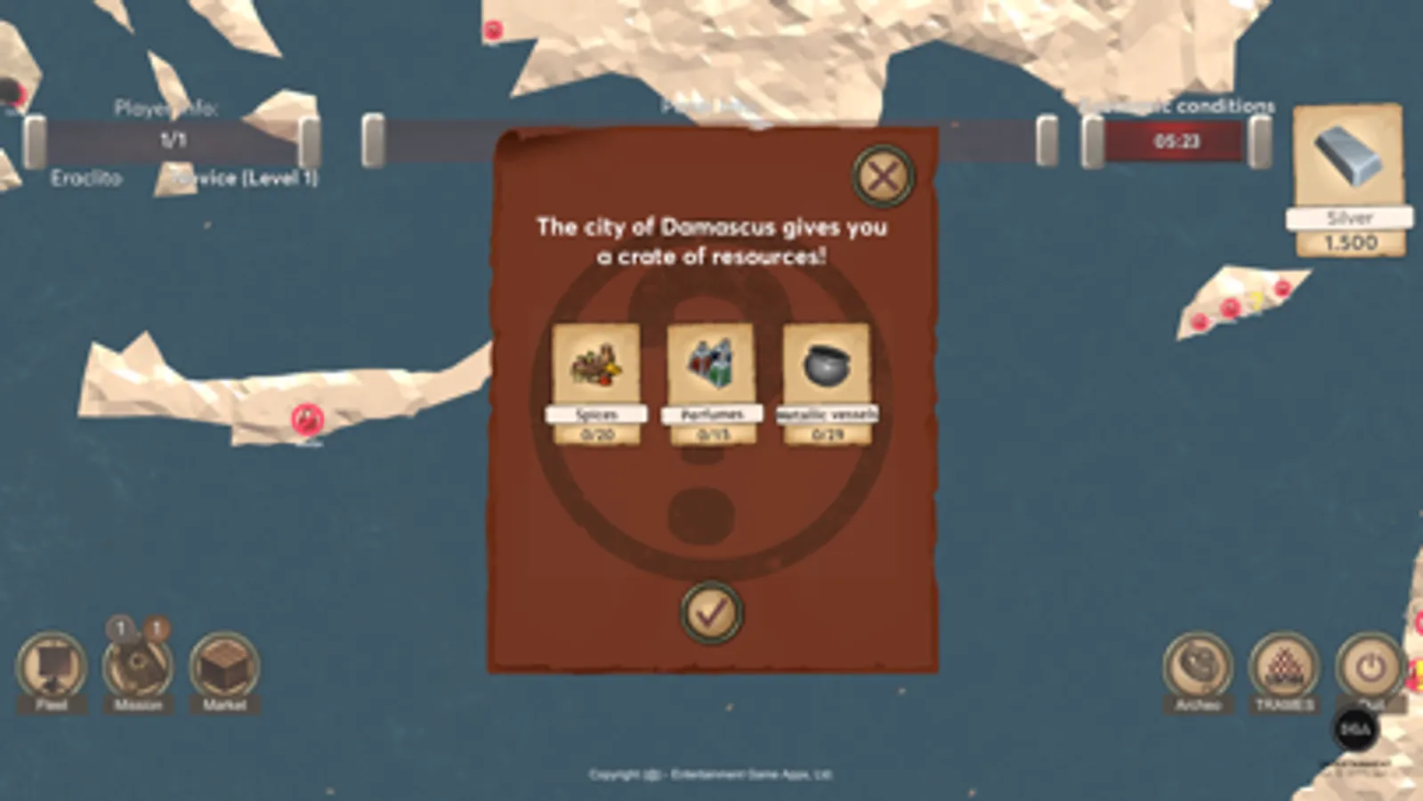 The goal of the game is to develop the Phoenician settlements by implementing their trade activities and moving resources across the Mediterranean Sea, along specific routes and with historically-accurate means of transportation. To progress through the 50 game-levels players are required to fulfil as many missions as possible. Each mission consists of accomplishing commercial expeditions by transporting goods (featured as resource-cards) from one town to another. As mission-rewards, players will be awarded resource-cards and sometimes special cards.