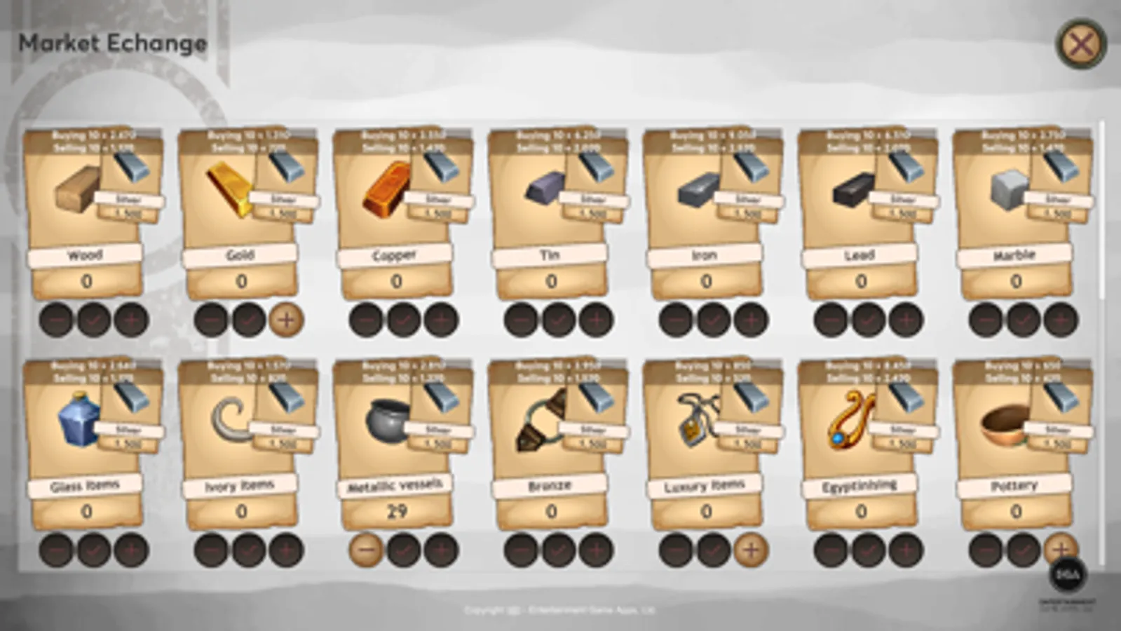 The resources featuring in the game are broken down into 30 categories mirroring the characteristics of ancient trade: Wood, Silver, Gold, Copper, Tin, Iron, Lead, Marble, Glass items, Ivory items, Metallic vessels, Small bronze items, Luxury items, Egyptian/Egyptinising items, Pottery, Purple dye, Fine textiles, Incense, Perfumes, Spices, Cereals, Salted Fish, Salted Meat, Exotic Animals, Olives and Olive Oil, Wine, Salt, Slaves, Amber, Honey.
