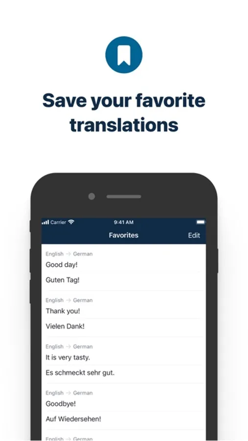 - Saved translations: Tap the bookmark icon and save words and phrases for future reference or to build your own vocabulary (all languages)