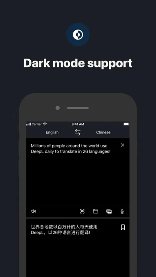 - Dark mode: Protect your eyes from bright light and save your battery life while translating