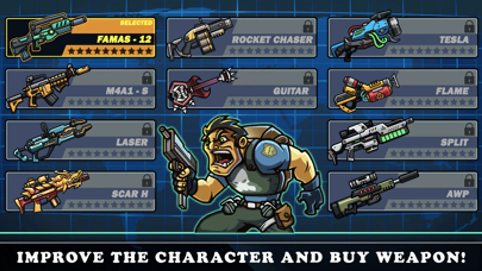 * Different kinds of weapons as shotgun, rocket