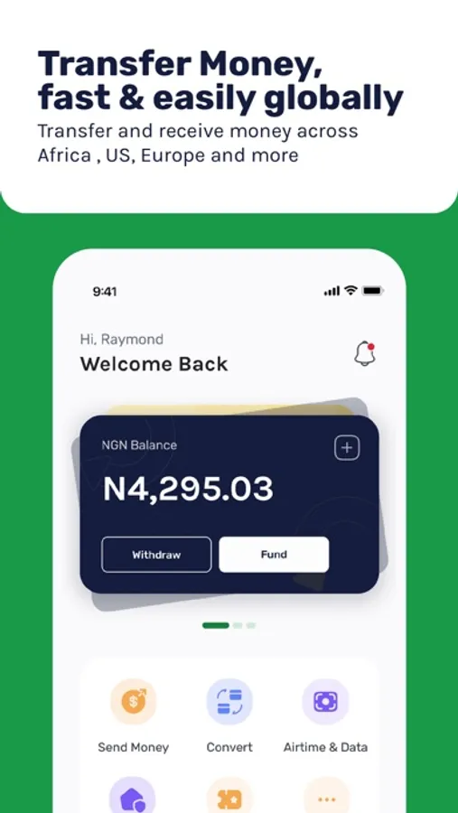 In this money transfer app, you can send and receive funds internationally using multiple currencies and make online payments with virtual cards. Includes features for fast withdrawals, bill payments, currency exchange, and airtime top-ups.