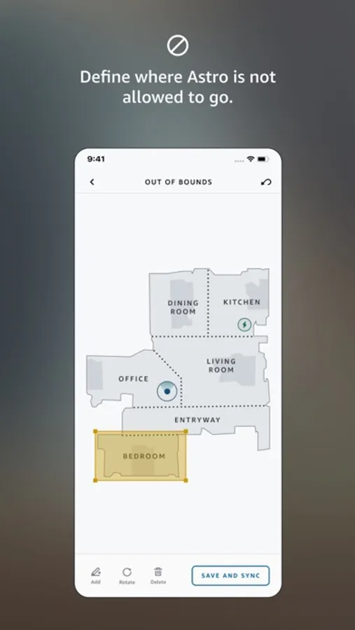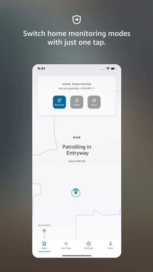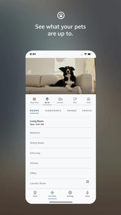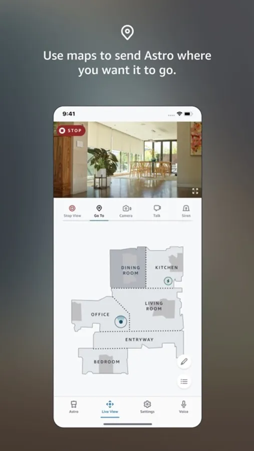 With the Astro app, you can see a live view of your home and check in on specific rooms, people or things. During setup, Astro learns a map of your home that you can view in the app at any time. Simply tap where you want Astro to go to start a live view, then raise or lower the periscope for a better look. You can even sound a siren remotely if you see something suspicious.