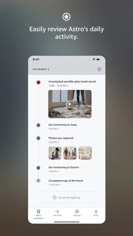 * Receive activity alerts when Astro detects an unrecognized person, or detects certain sounds with Alexa Guard, like glass breaking, and smoke or CO alarms.