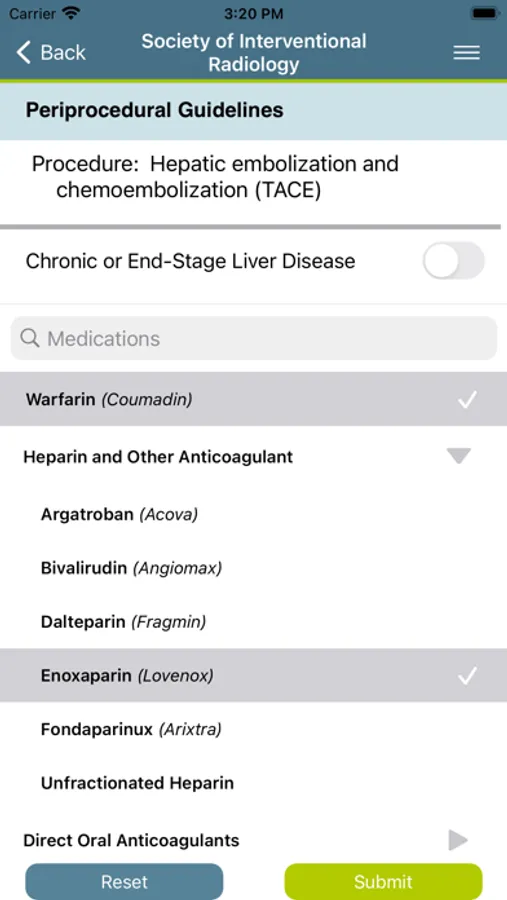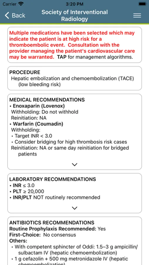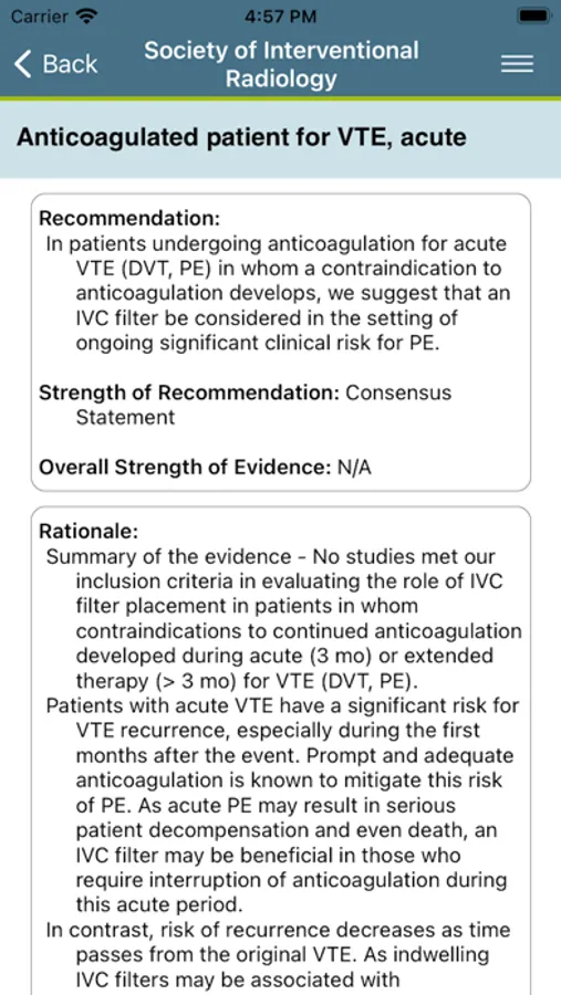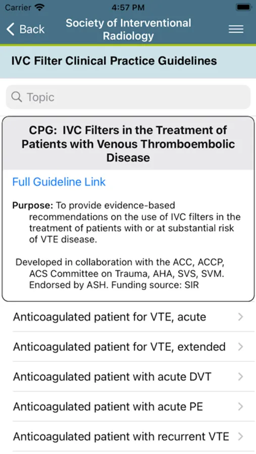 The app includes an interactive periprocedural recommendation calculator that generates scenario-specific anticoagulation and antibiotic recommendations based on the SIR consensus guidelines. Users can input medications and patient factors to generate recommendations tailored for the patient’s and procedural bleeding risk. The Clinical Practice Guidelines for IVC Filters provide evidence based guidance for the management of patients with thromboembolic disease. The app will be continually updated to include new Clinical Practice Guidelines (CPGs) and tools to assist in clinical decision-making.