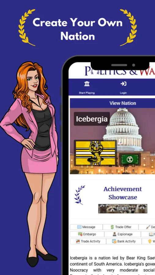 With a thriving community around the game that includes player-run international organizations that handle in-game banking, nation building loans, in-game news organizations, and much more, Politics and War is an online nation building game like no other. Download it for free and start playing today.