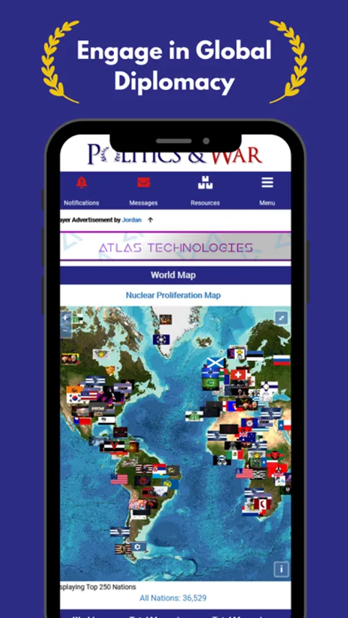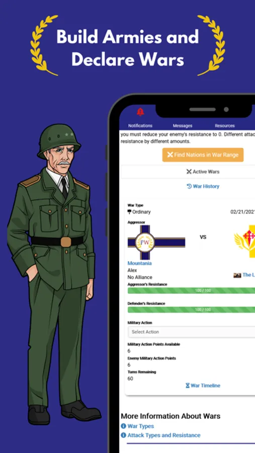 Raise armies and wage war with other players. With 7 different military units, including nuclear weapons, you can raid neighboring nations to loot money and resources or wage all out attrition war to pummel your opponents into the ground.