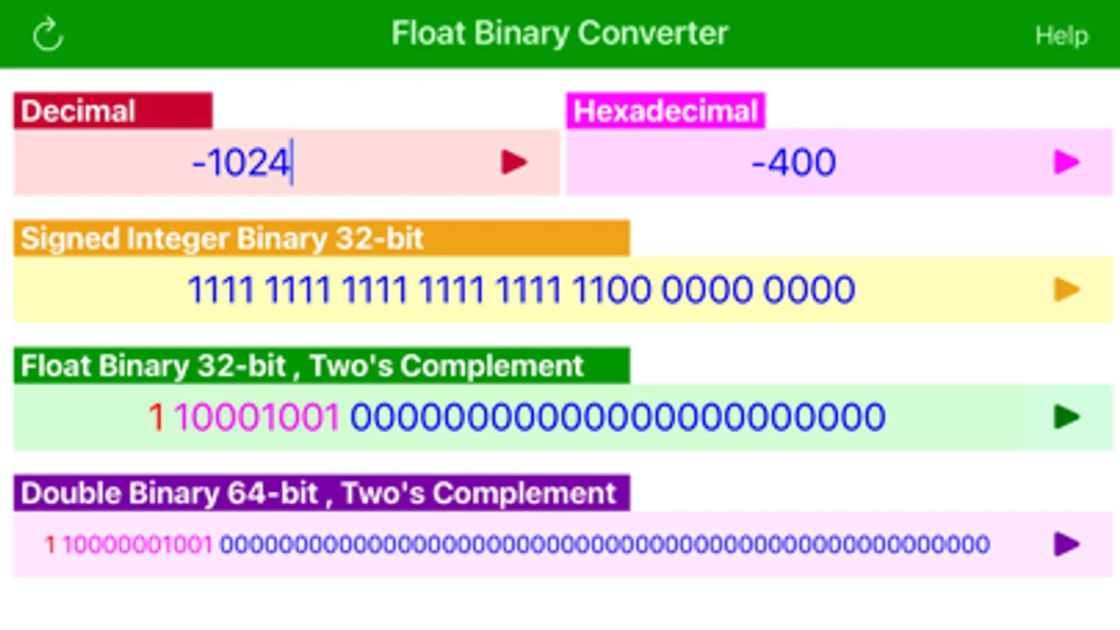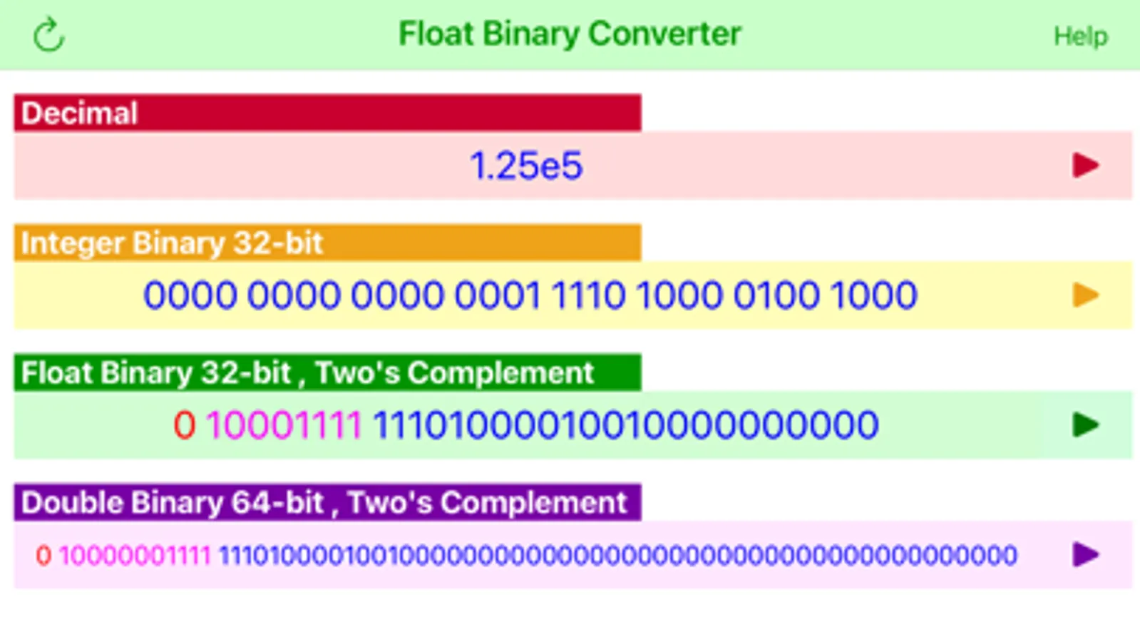The main screen provides input and output of the the five numeric representations. Decimal field accepts integer, floating point and scientific representations. Each field has an associated run button, that converts the input to all other representations.
