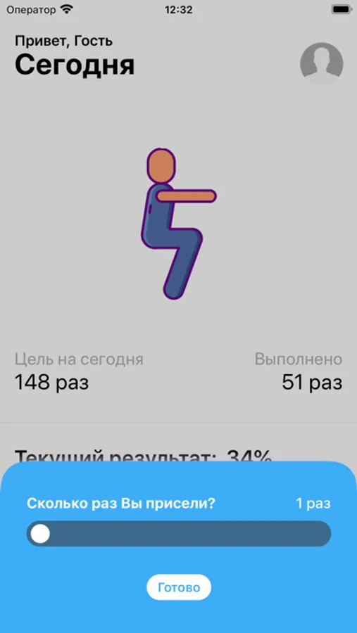 Приложение поможет Вам в занятиях физической культурой, а именно в приседаниях. Установите цель по количеству приседаний и отмечайте в Приложении каждый подход для достижения целевого показателя. Трижды в день Приложение напомнит Вам о необходимости продолжить упражнения. Желаем Вам успеха!