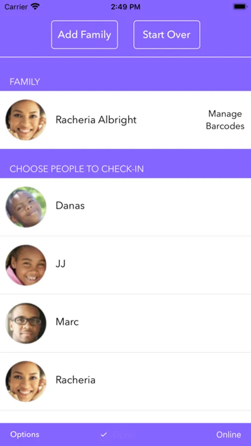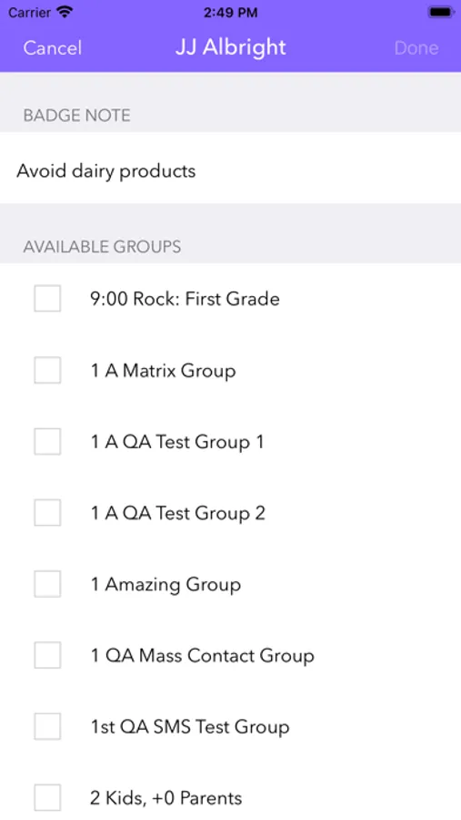 You can choose the group to check each person into, add new people and families, and edit the notes that print on the badges.