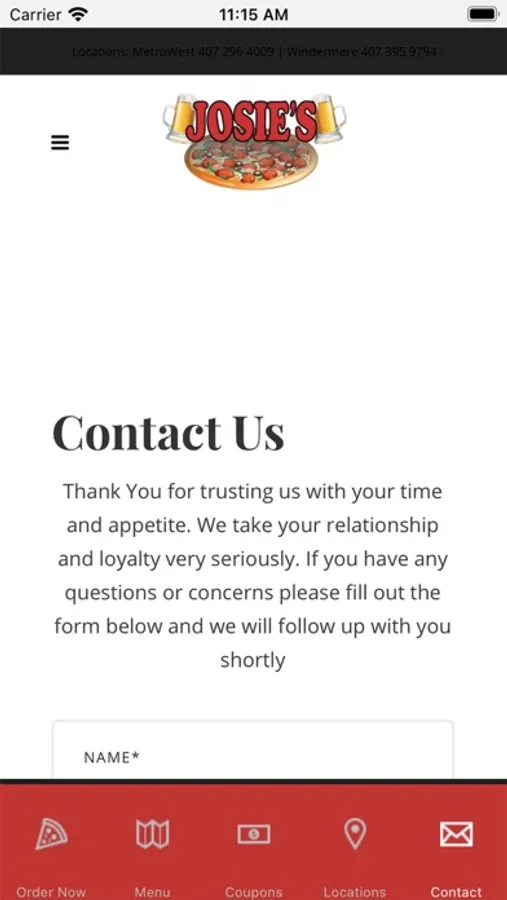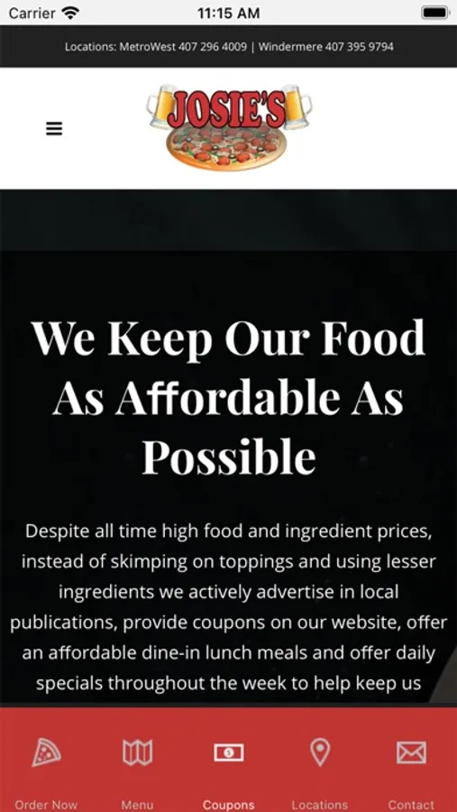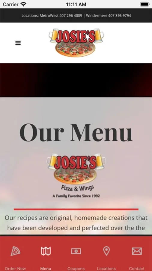The Josie's Pizza & Wings app! Josie's Pizza & Wings is an Orlando area restaurant serving up N.Y. style pizza, wings, subs and more. In business and family-owned for over 28 years at our original location in MetroWest. Now with a second location in Windermere. Download our app for easy online ordering, to view our menu, get directions to our location, receive app only specials, get coupons, connect to our social pages, and so much more.