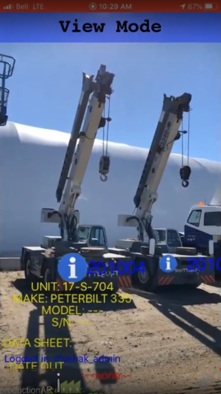The app has three modes: the default "View Mode" which shows information associated with a visual code, QR-code, or barcode and has the option (if your login has data "Add Permission") to upload multimedia files to the visual code. If you tap the blue 'I' icon hovering over a visual code you can enter "Full Item Mode" where you can see the entire record (or the fields your login allows you to see). In "Scan Mode" you are viewing and possibly changing only one column in the database, for example "Received on Site". If a visual code has not yet received an entry for that column it will appear as a red circle, if it has data already it will be a green checkmark. You can set the "Scan Distance" so that if you get within that distance it will update that field (if empty or with "Re-Scan" enabled). In "New Job Mode" you can aim at a visual code that is not yet in the database and create a new entry.