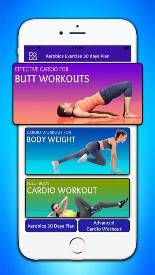 Aerobics exercise is also known as fat burning exercise or cardio exercise workout and it's an important part of an overall fitness for weight loss. Daily cardio workouts reduce belly fat and burn calories. Weight loss and fat loss is possible doing our daily workout and home exercises. Cardio Workouts provides you fitness programs, step you through some of the best cardio exercises workouts and training.