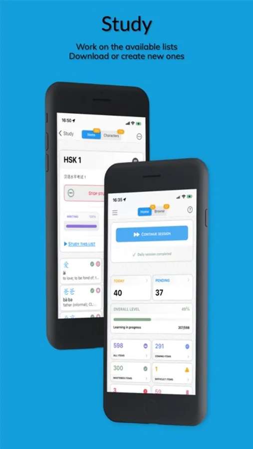 • Study the lists already available or create your own lists of Chinese characters and words. Just enter you words in Chinese and the app will translate them. You can even download commonly used Chinese textbooks words lists.