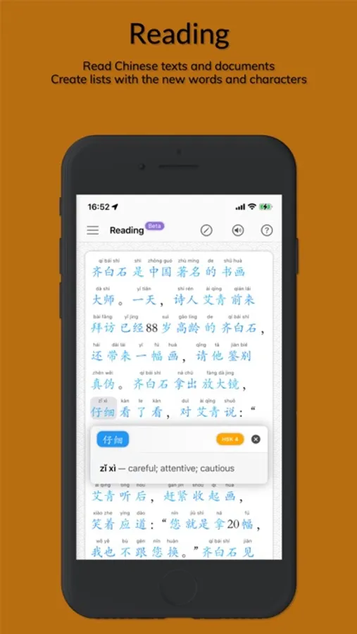 • Read Chinese texts and documents easily in the reading section.