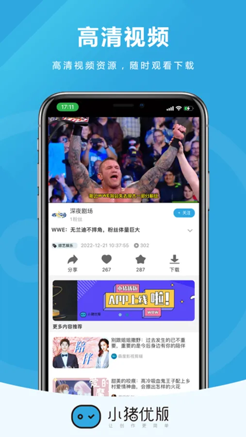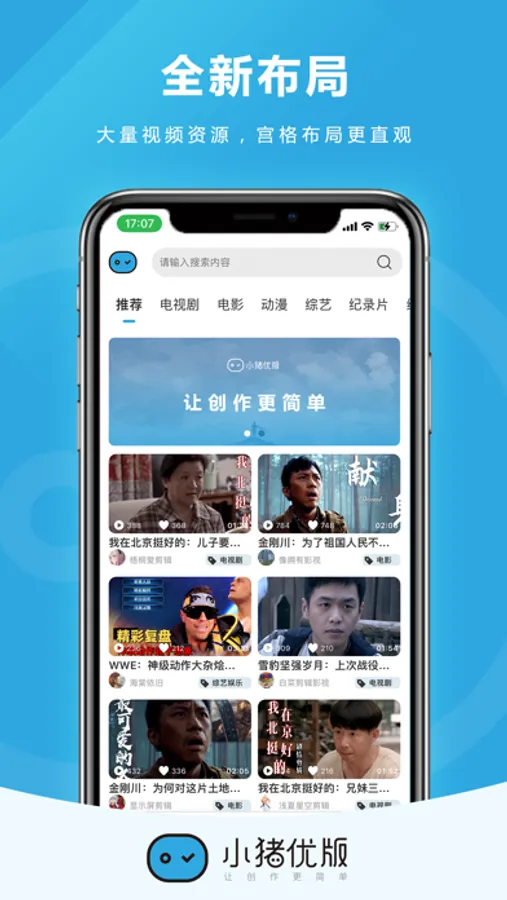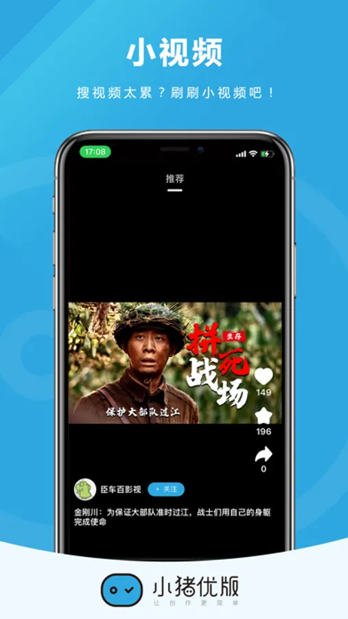 小猪优版APP是百鸣旗下的移动端短视频内容生态产品,覆盖电影、电视、综艺、少儿、动画等优质短视频内容。基于人工智能算法为用户推荐最新、最热、最有趣、最有营养的短视频内容。
