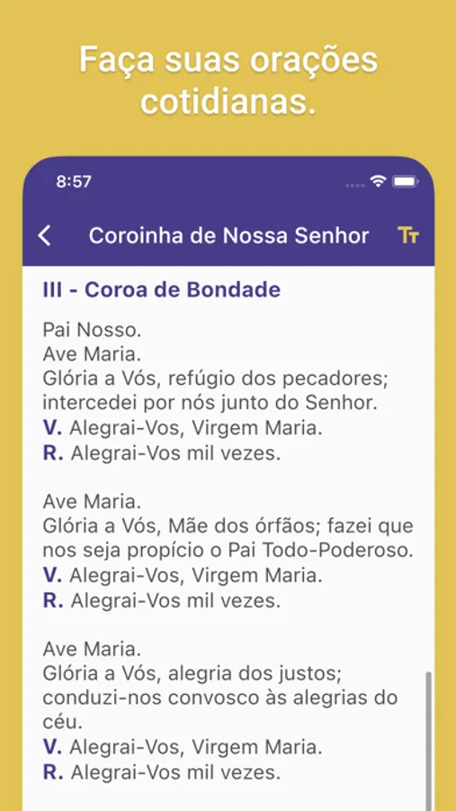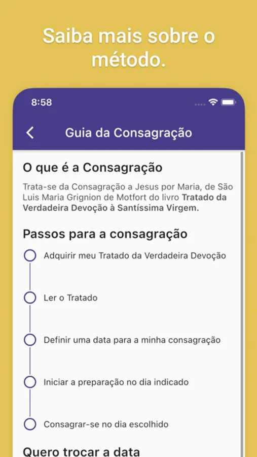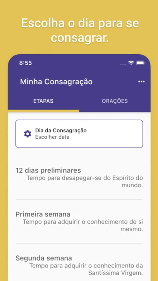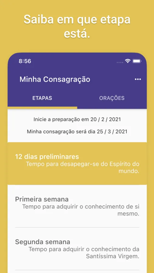 O aplicativo mostra quando você deve começar a sua preparação, ou renovação, e o acompanha informando sempre qual etapa você está e quais orações deve rezar.