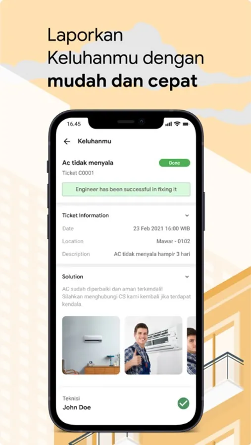 Laporkan gangguan / komplain / masalah yang ditemui disekitar dengan cepat dan instan. Setiap progress penyelesaian laporan akan diinformasikan kepada Tenant secara real-time dan transparan.