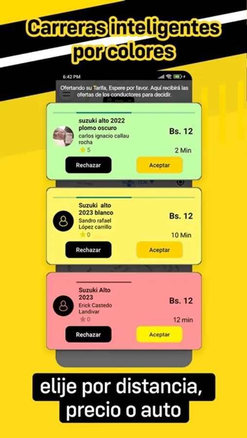 Uste tiene el poder de elegir de acuerdo a su criterio, por distancia de acuerdo a los colores de tiempo de proximidad ofreciendo la tarifa que mejor crea conveniente, o de acuerdo a los datos del vehículo, el modelo y el conductor.